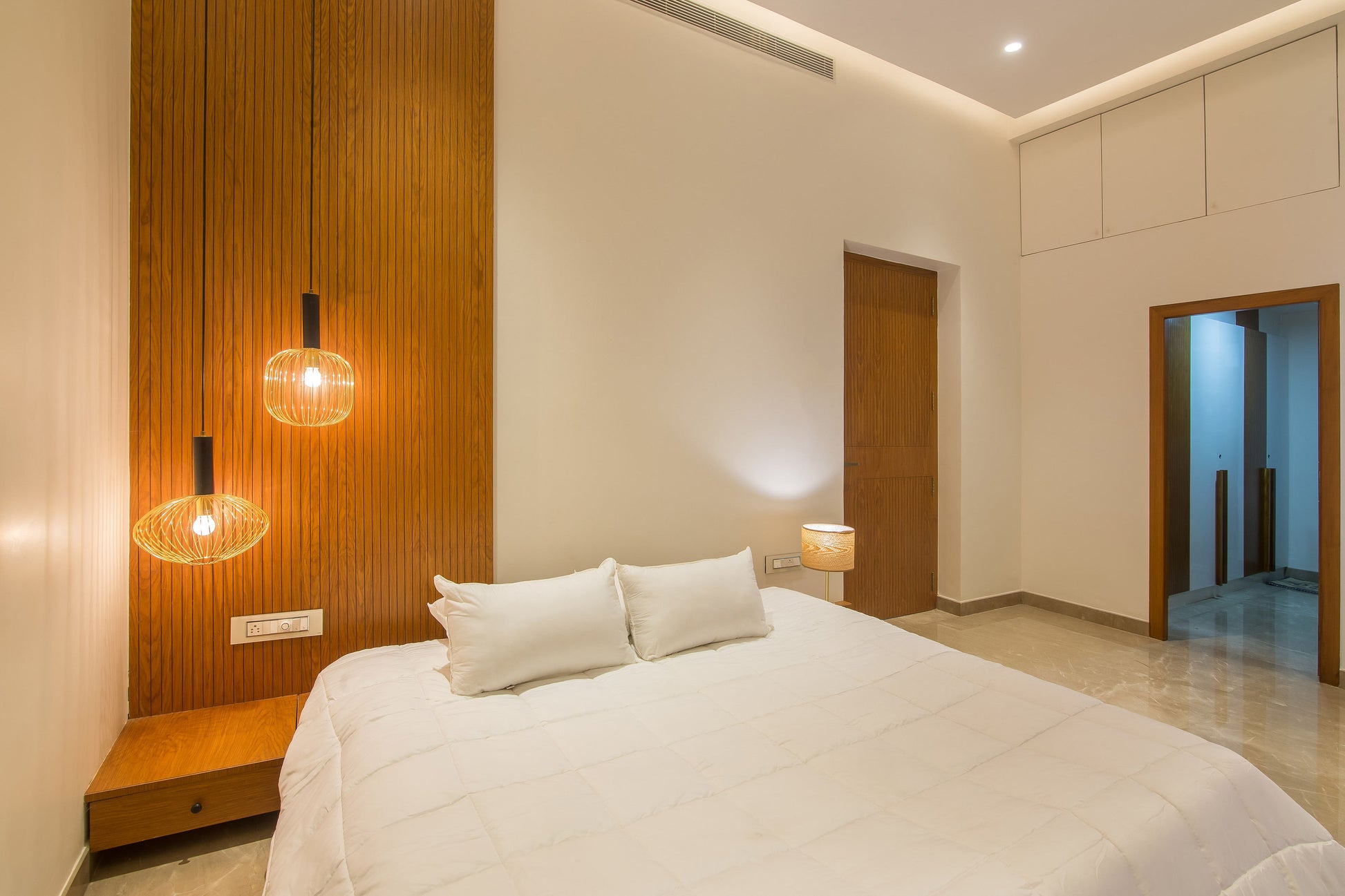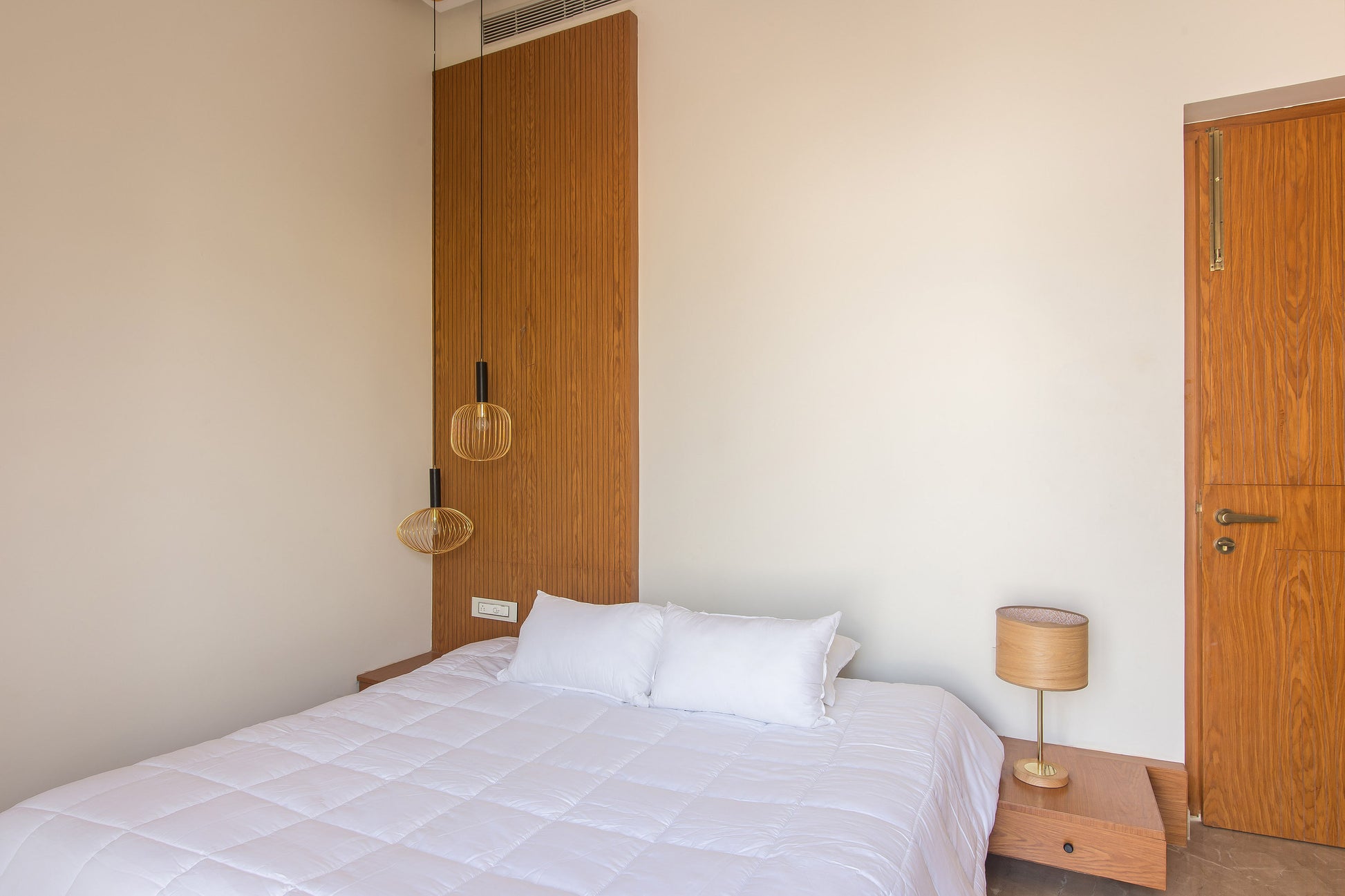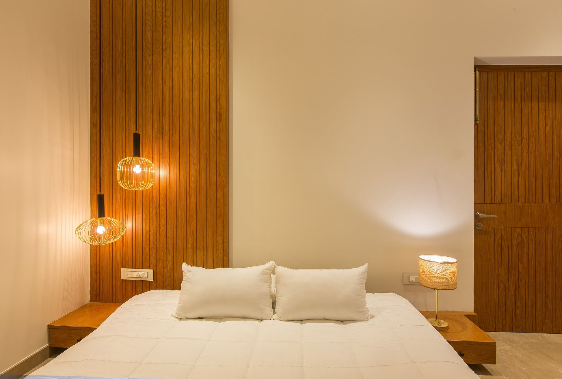 A neutral palette of wood, taupe, and soft textiles creates a calming atmosphere, while subtle accent elements—like wall cladding and brass fixtures—add understated richness. Custom wardrobes and floating nightstands enhance functionality without compromising on aesthetics. This bedroom embodies Mod Faab’s signature: modern living that feels personal, poised, and timeless.
