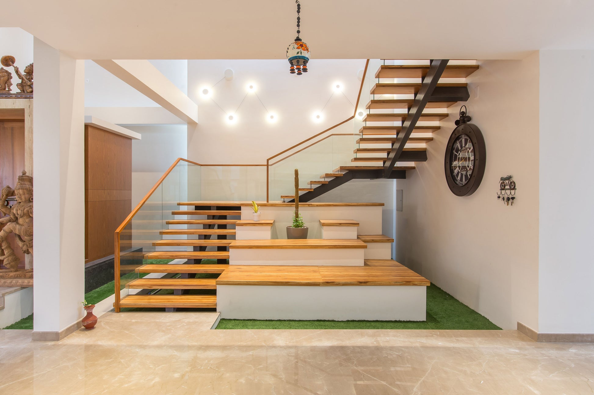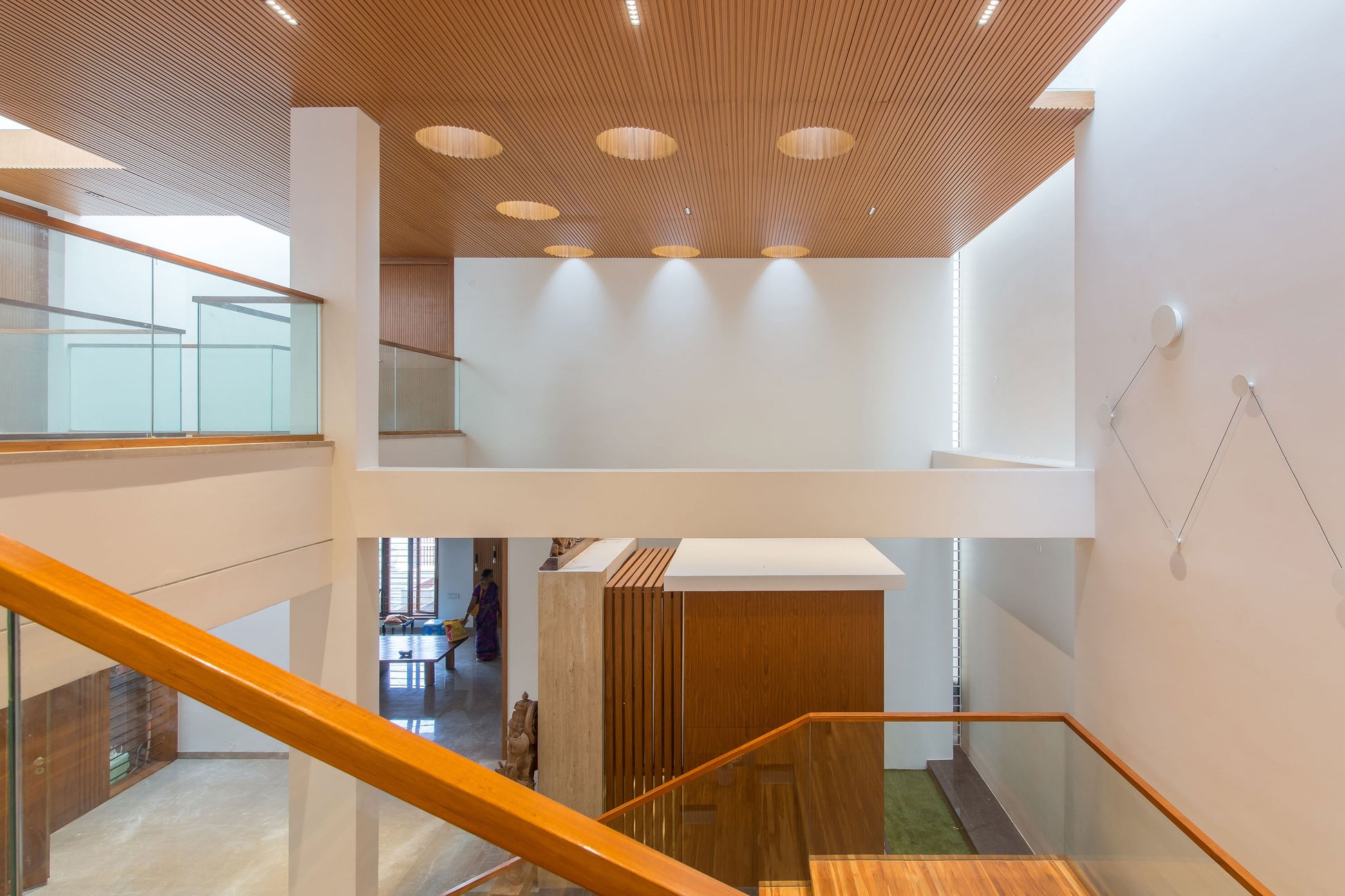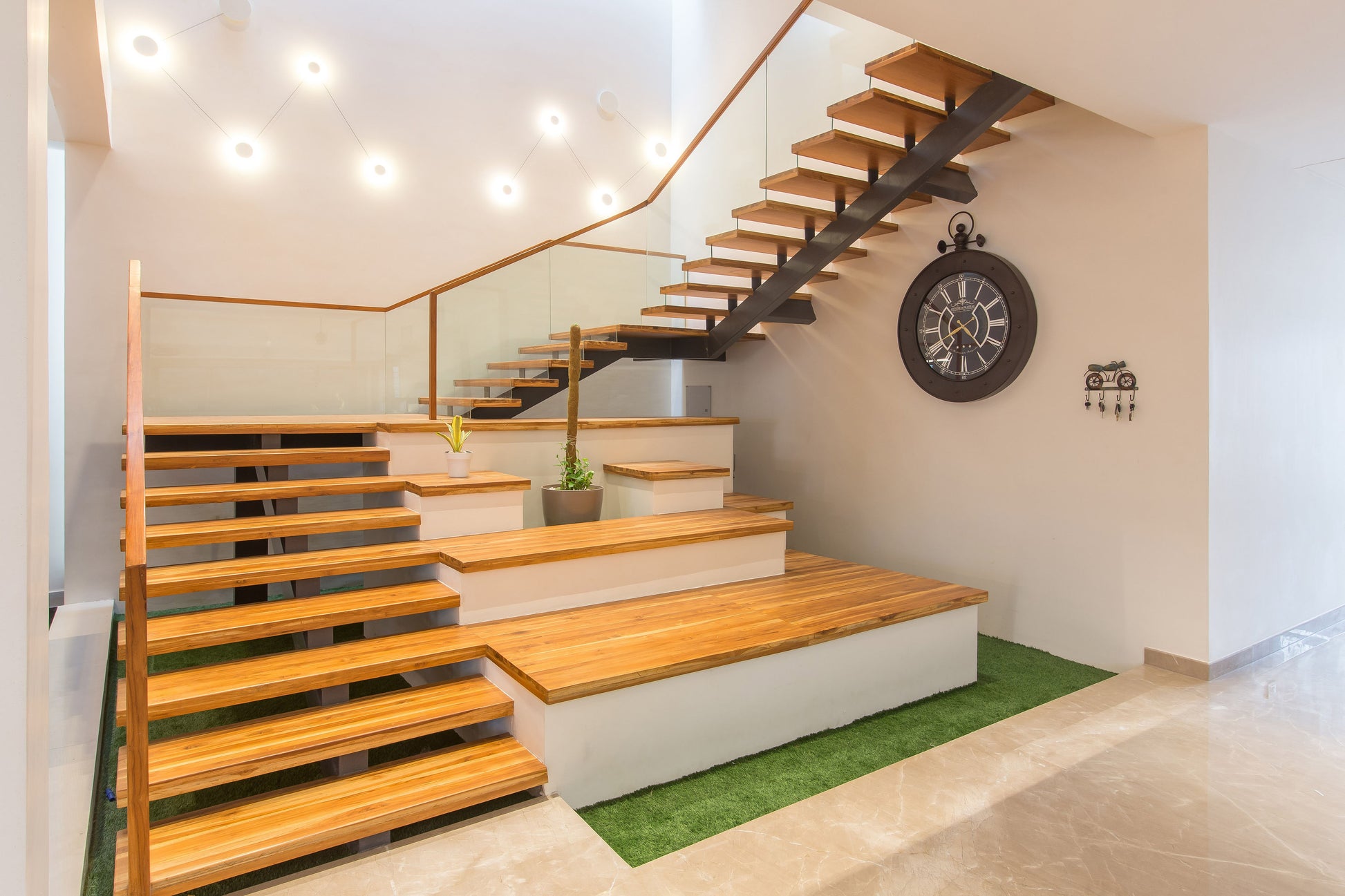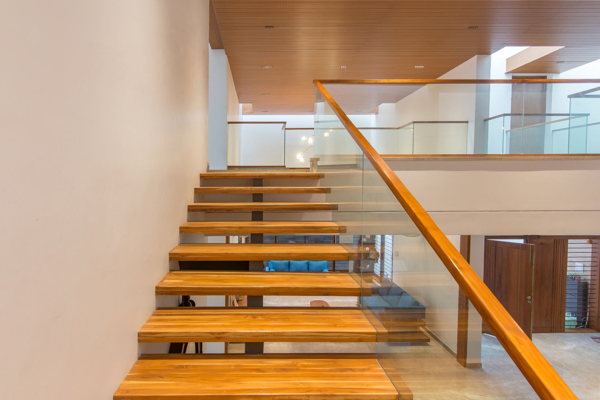 Stone cladding, wood-textured elements, and matte finishes are interwoven with large glass panels to allow light and depth to flow naturally. The elevation is designed not just for visual appeal, but for functionality—providing privacy, insulation, and a timeless curb appeal. Mod Faab’s architectural language here is both sculptural and smart, making the home stand out with quiet confidence.