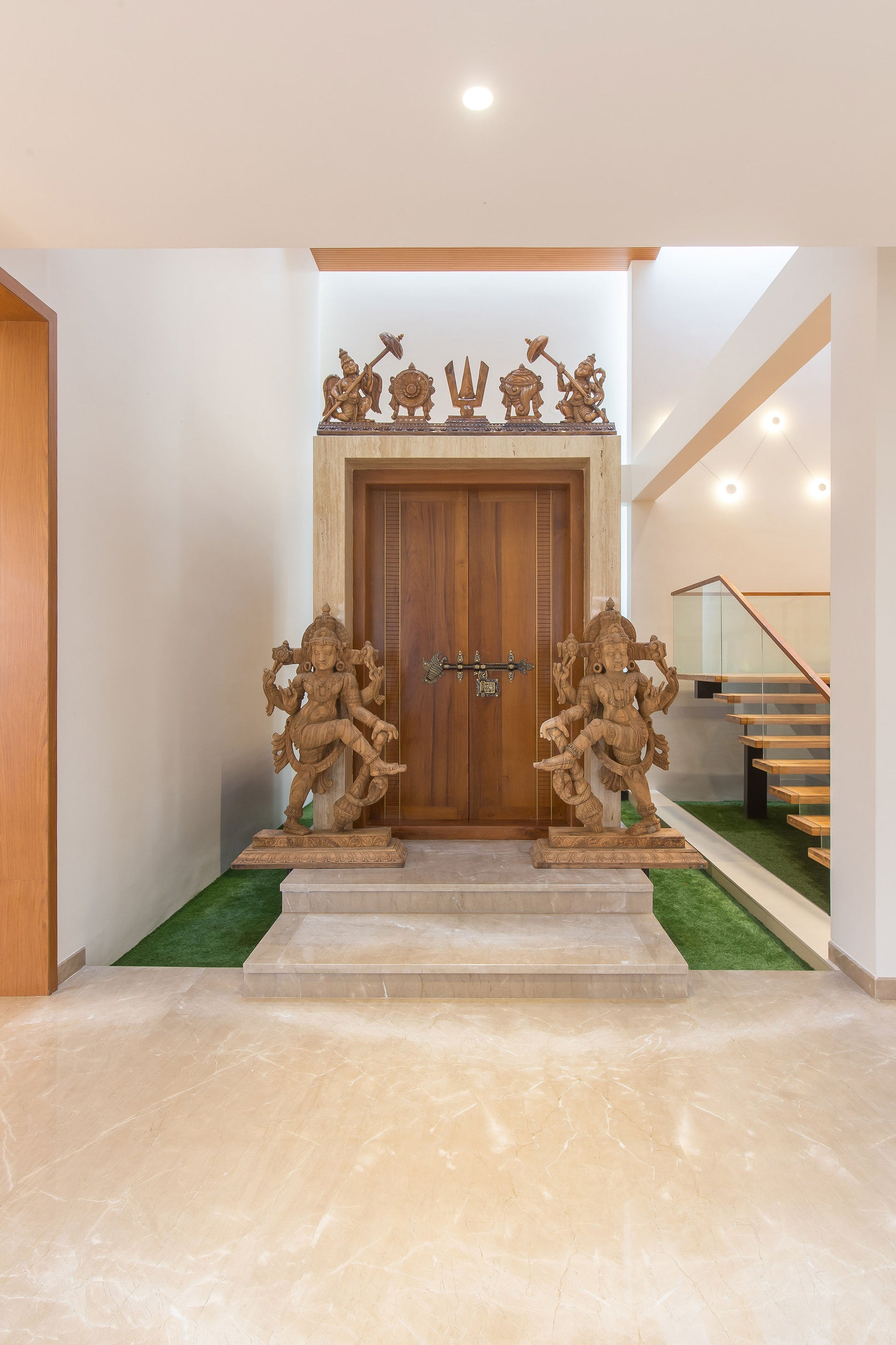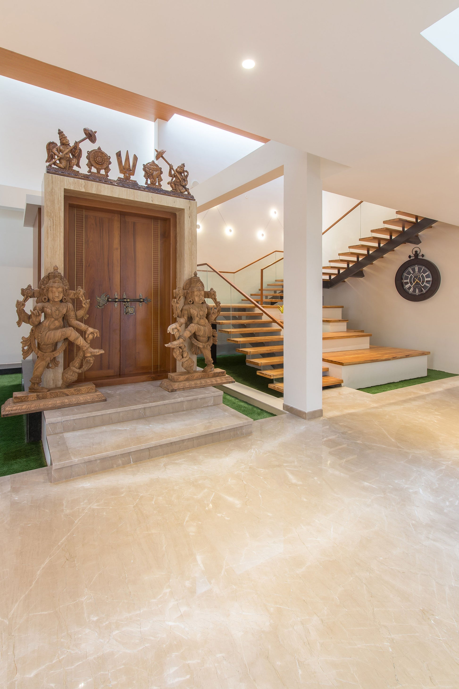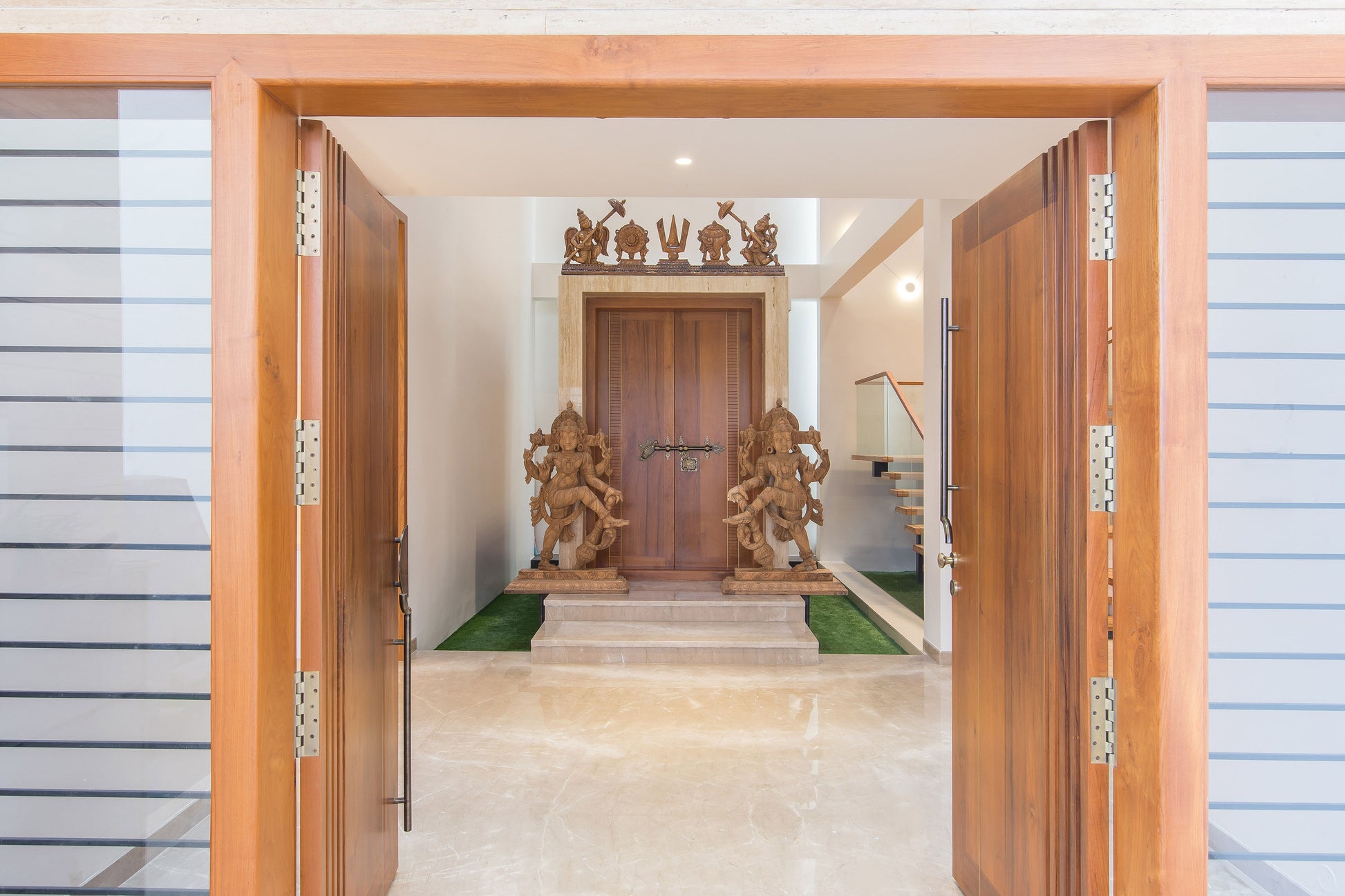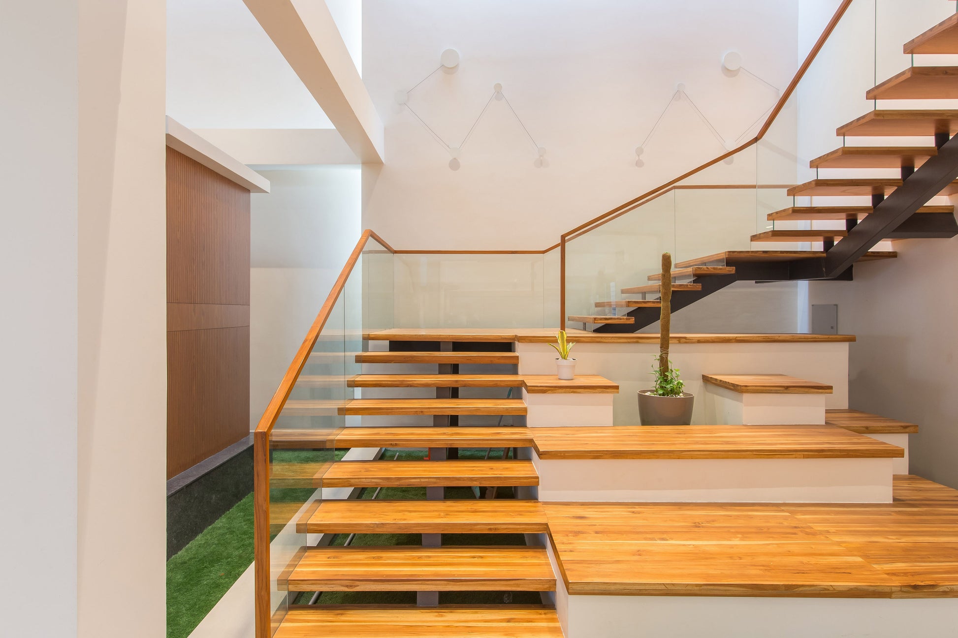 Stone cladding, wood-textured elements, and matte finishes are interwoven with large glass panels to allow light and depth to flow naturally. The elevation is designed not just for visual appeal, but for functionality—providing privacy, insulation, and a timeless curb appeal. Mod Faab’s architectural language here is both sculptural and smart, making the home stand out with quiet confidence.