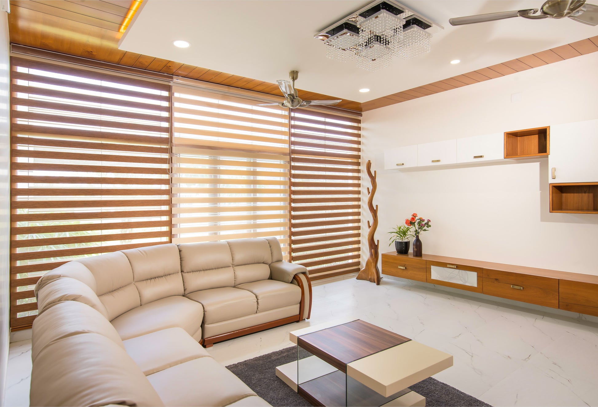 Modern Living Room Design India, Mod Faab Interiors, Contemporary Wood Finish Living Room, Elegant Living Room Interior, L-Shaped Sofa Design, Stylish TV Unit Ideas, Ceiling Design with Wooden Panels, Living Room with Daylight Blinds, Luxury Residential Interiors