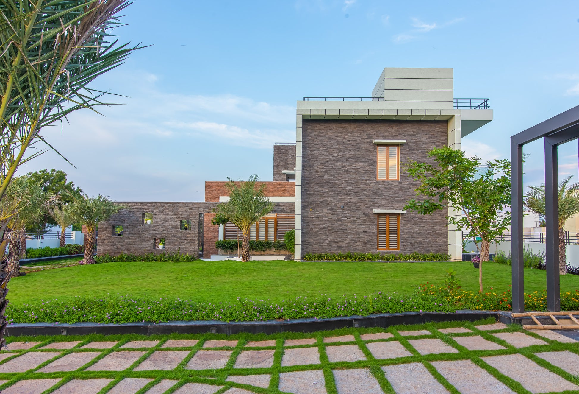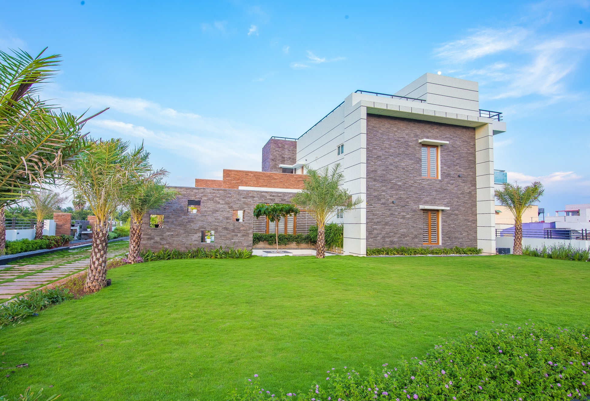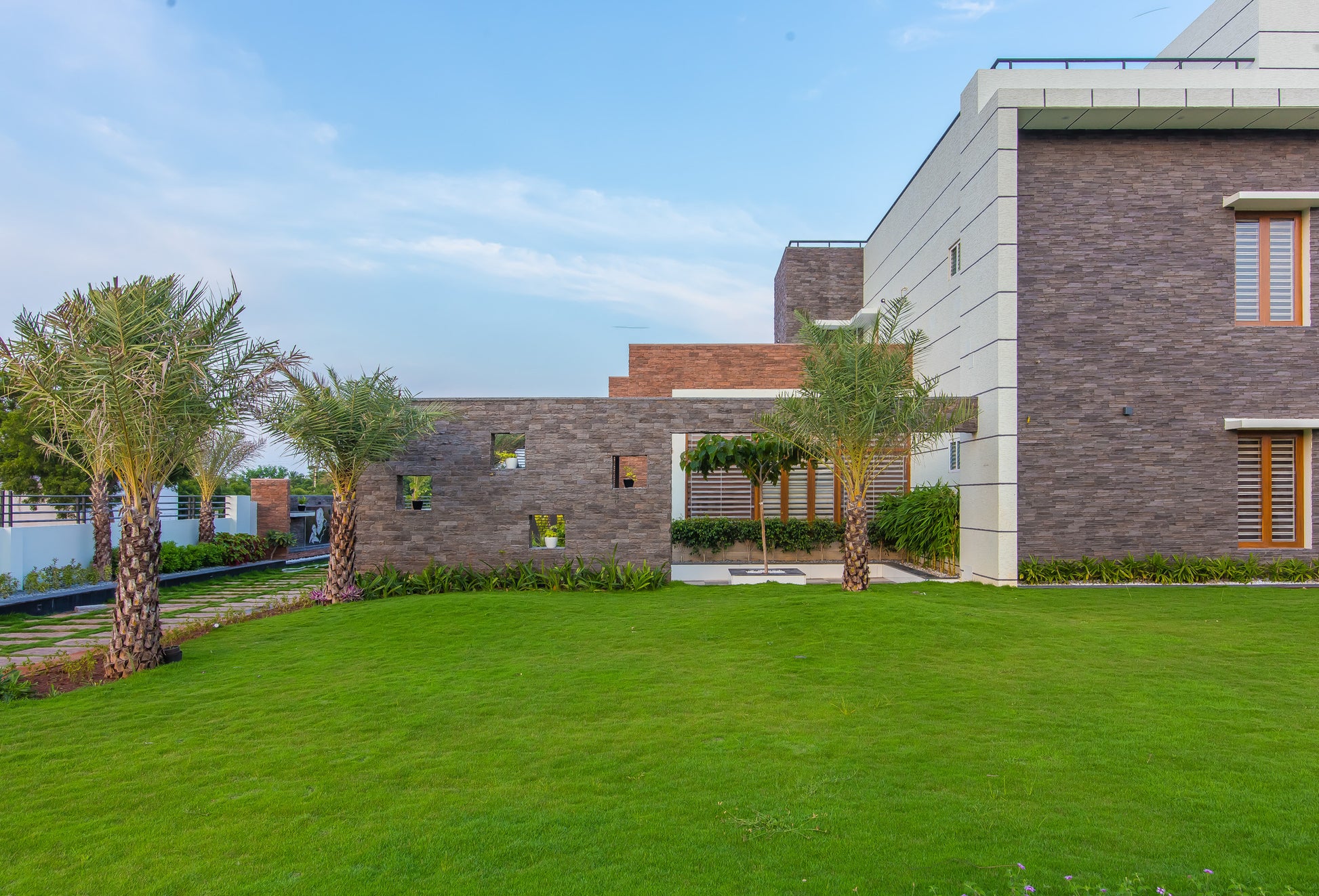 The landscape of Dr. Sakthivel Residence is a seamless extension of its modern architecture—designed to elevate everyday living with a touch of nature’s calm. The lush green pathways, manicured lawns, tropical plantings, and sculptural palms create a serene outdoor canvas that flows around the home.