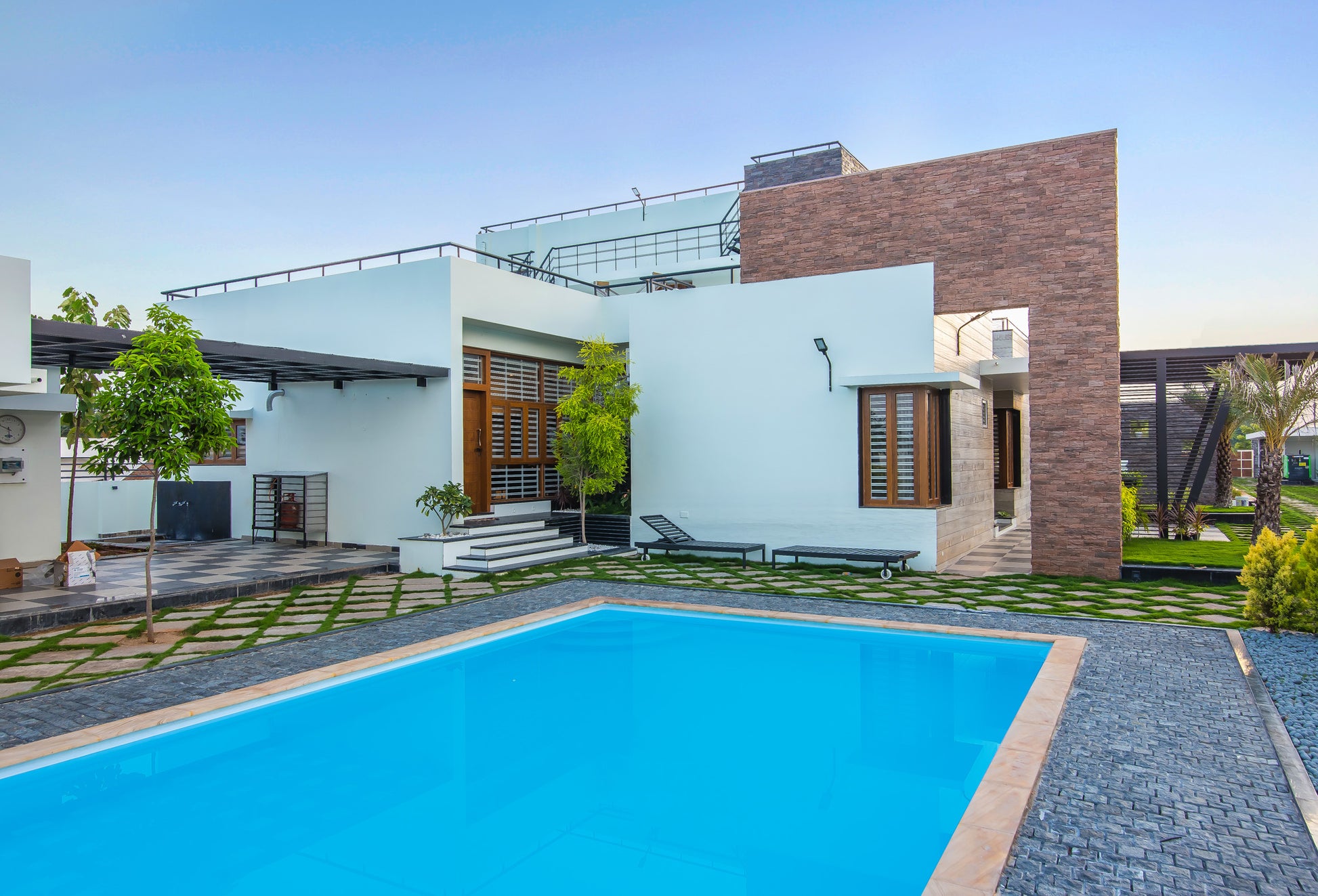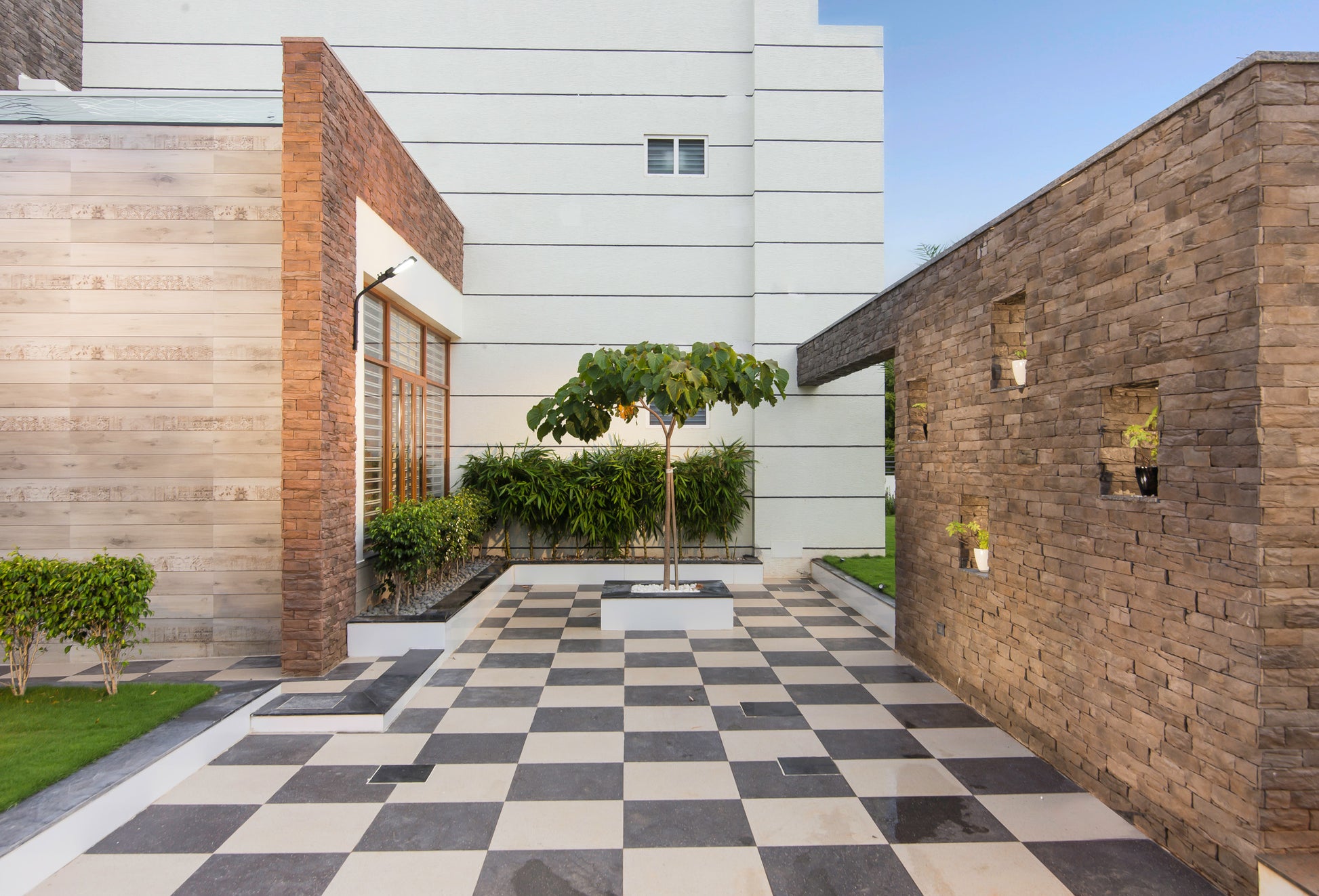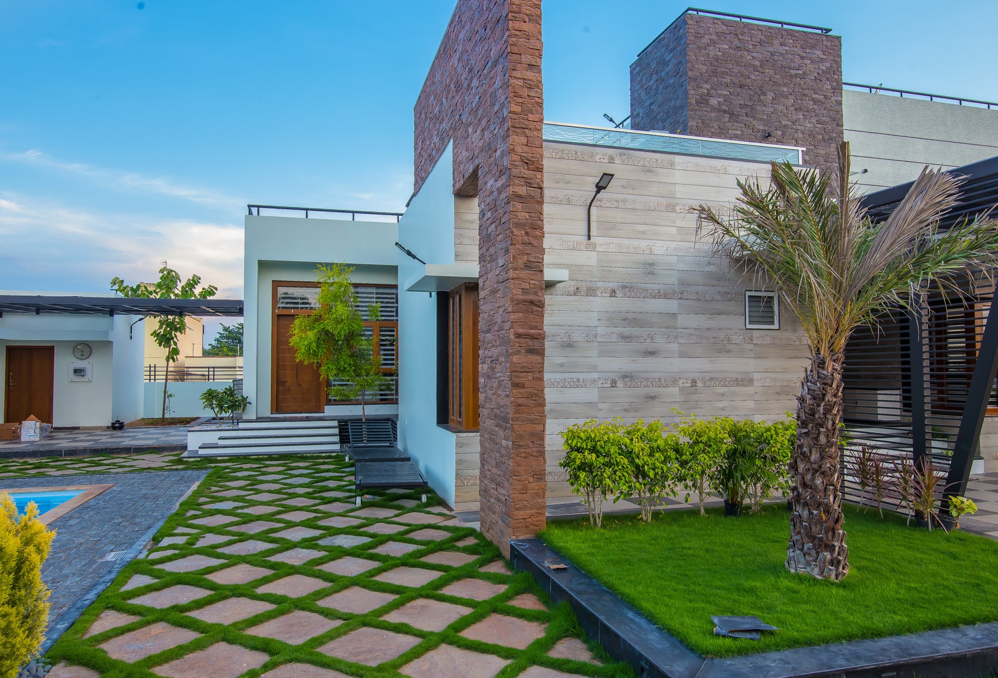 The landscape of Dr. Sakthivel Residence is a seamless extension of its modern architecture—designed to elevate everyday living with a touch of nature’s calm. The lush green pathways, manicured lawns, tropical plantings, and sculptural palms create a serene outdoor canvas that flows around the home.